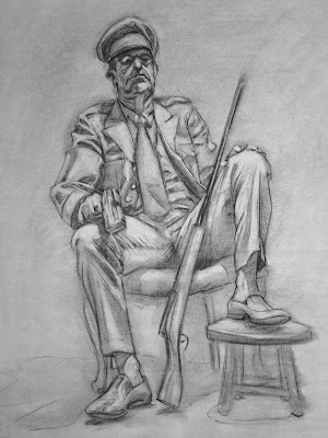We got to do two one-hour poses in Figurative Concepts this week, which I always find fun. I'm a bit rusty with longer poses, so the focal point isn't as clear as it should be. The model really liked them! He even said I've got a future and that he wants to be in my comic book. Not sure what comic that is...he also said that he looks like one of Moammar Gadhafi's men and added "No wonder they wanna kill him." I laughed, as I assumed it to be a bit of topical humor. Anywho, vine charcoal, 2B charcoal pencil, and smooth newsprint: