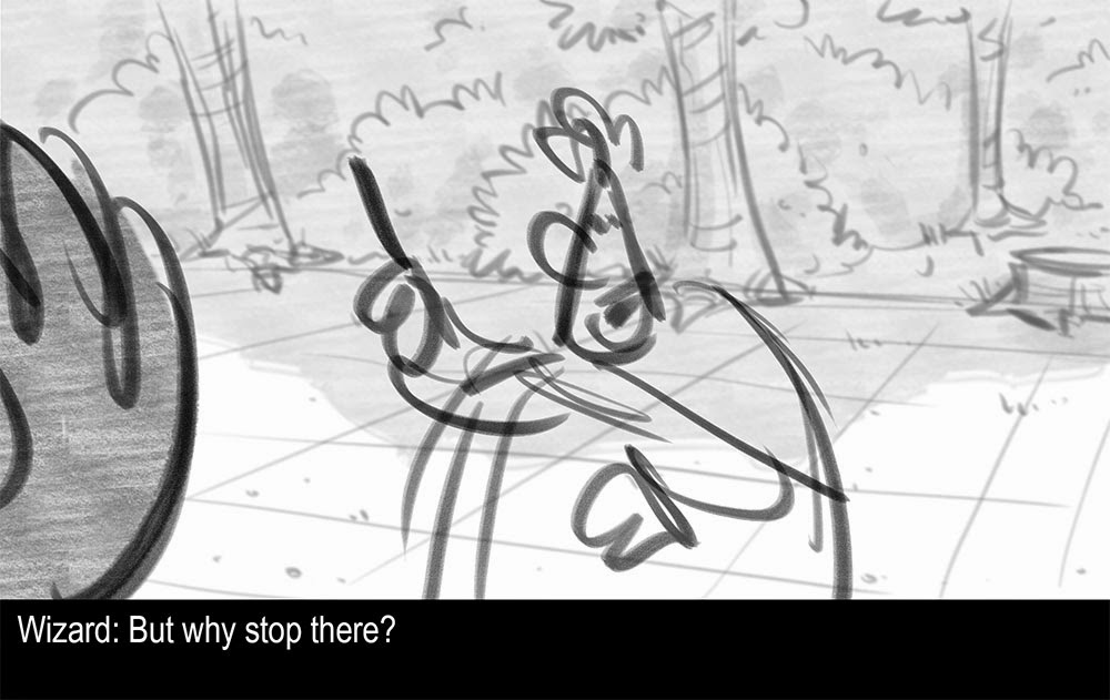 Well yes, there's that tale. But I have another, behind-the-scenes tale: Back in April, during some down-time after a Smurfs screening, I decided to put together a short story to use to update my portfolio. Diving into the archives of leftover stories I had from college, I found one about Merlin and King Arthur fighting over a girl, which seemed good since Smurfs was also set in Medieval Times. I wouldn't have to switch gears too much. So I moved forward fairly quickly, reworking the story, designing characters, and storyboarding. Drawing primarily while at work, I didn't want to save a copy of any of my story locally on my work computer, so my trusty ol' portable flash drive held all my data. But I'm no fool! I would come home most days and transfer the files to my personal computer.